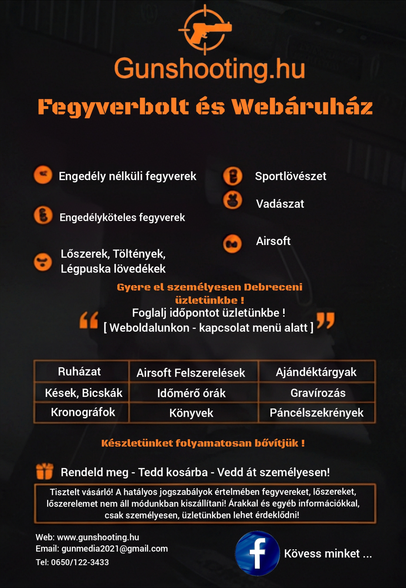 Tisztelt vásárlók! Hamarosan megnyitjuk üzletünket, ahol lehetőség lesz a megrendelt termékeket átvenni személyesen! Üzletünkben megtalálható lesz az engedélynélküli és engedély köteles fegyverek is!