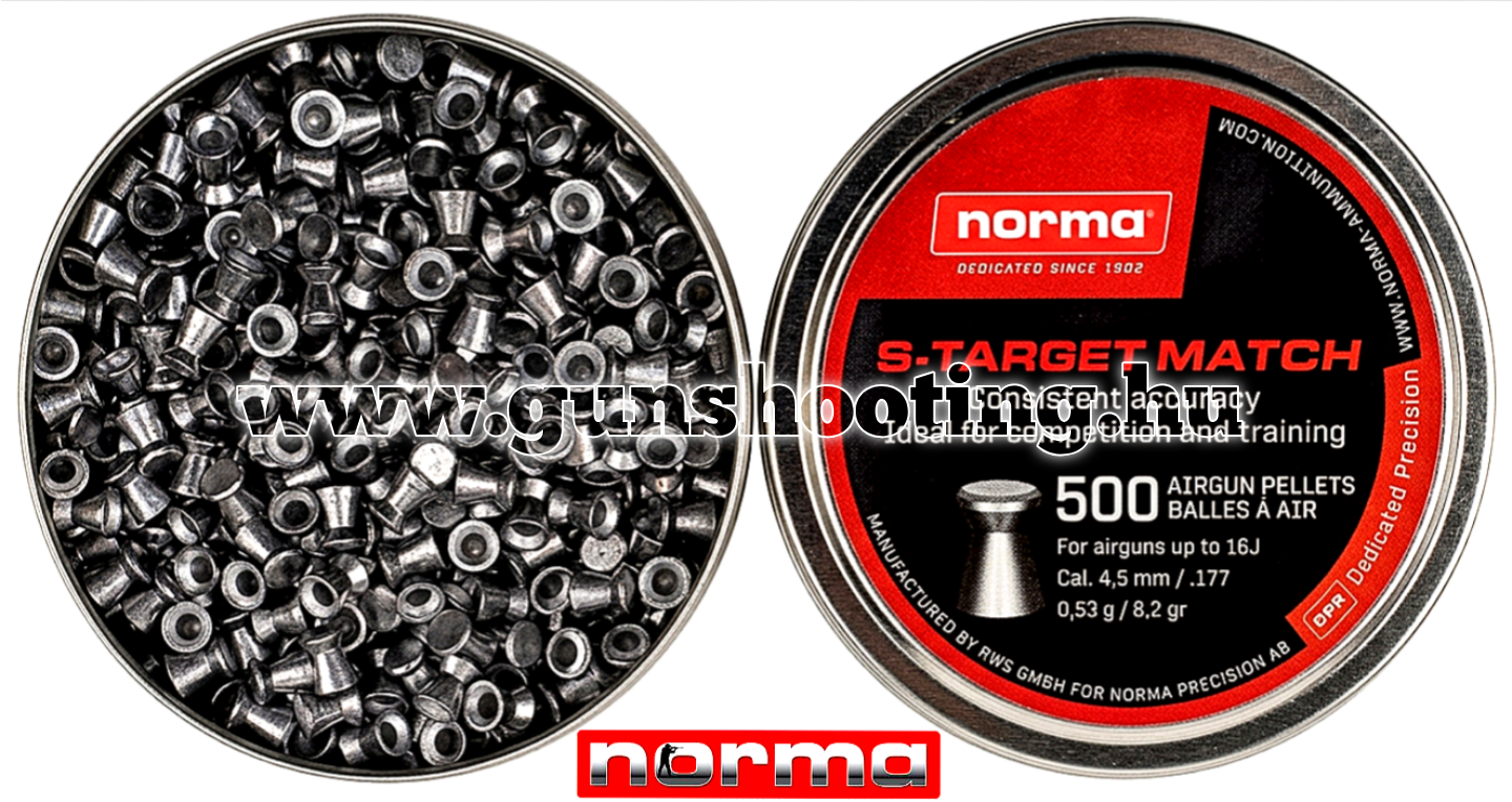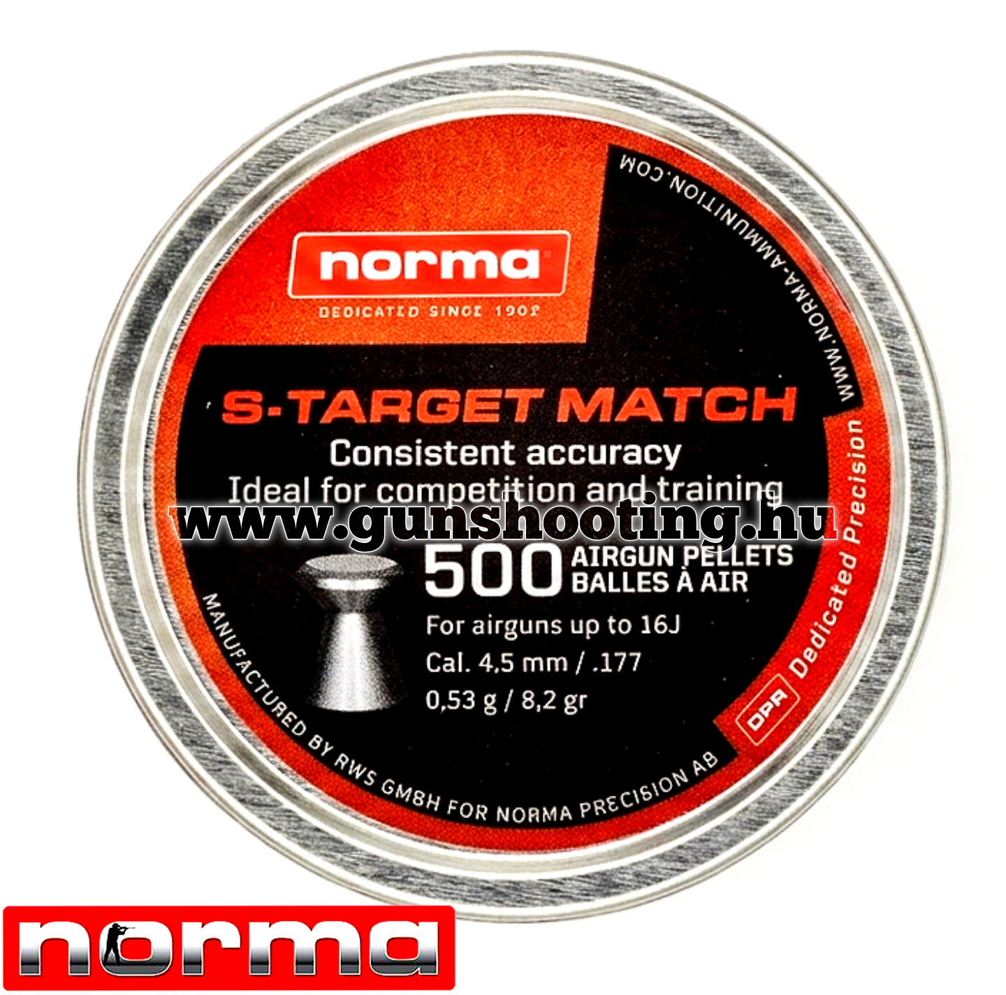 A lövedék lapos fejű (Wadcutter) kialakítású, ami a céllövészetben a legnépszerűbb forma. Ennek köszönhetően a lőlapon tűéles, körzővel rajzolt pontosságú lyukakat vág, így a találatok értékelése (pontozása) gyors és egyértelmű. A Norma S-Target Match egy precíziós légpuska lövedék, amelyet a svéd Norma Precision tervezett. A márka technológiai háttere garantálja az állandó minőséget és a szigorú gyártási toleranciát, ami elengedhetetlen a versenysportban és a magas szintű edzések során.