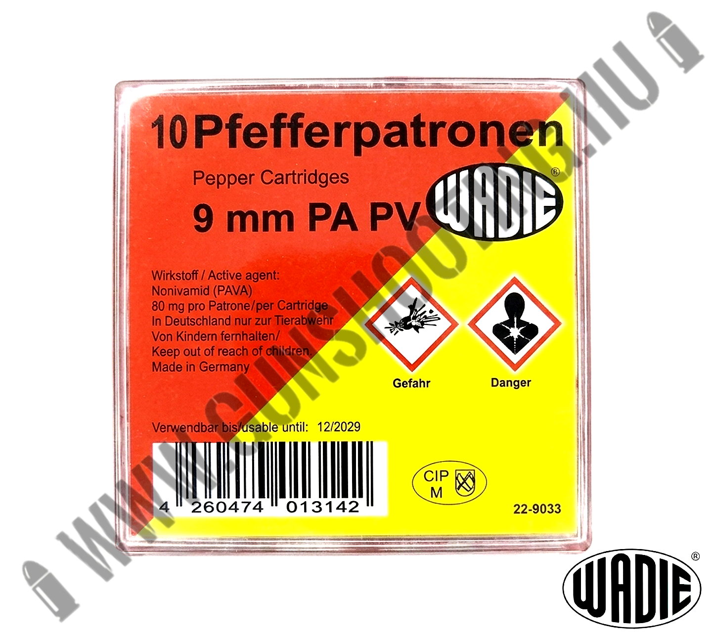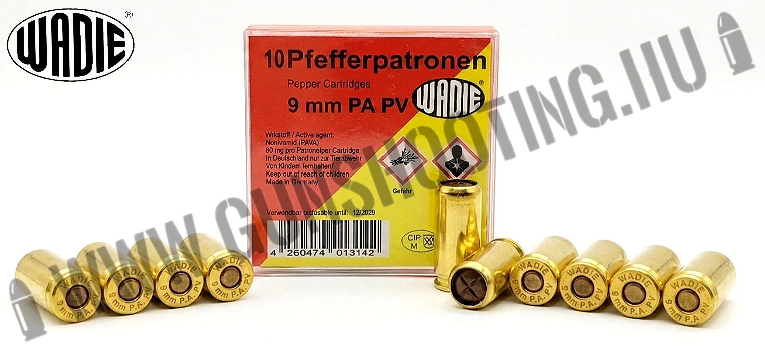 A német Wadie gyártmányú 9mm P.A. PV (Pfefferverlust) gáztöltény az egyik legmegbízhatóbb önvédelmi lőszer a piacon, amelyet kifejezetten szekrénytáras (öntöltő) gáz-riasztó pisztolyokhoz fejlesztettek ki. A technológia és a hatóanyag kombinációja garantálja a maximális megállító erőt vészhelyzet esetén. A PV (paprika) töltények egyik legnagyobb előnye a CS (könnygáz) töltényekkel szemben, hogy állattámadások ellen is rendkívül hatékonyak, valamint az ittas vagy kábítószer hatása alatt álló agresszorokra is intenzívebb hatást gyakorolnak, mivel nem a fájdalomküszöbre, hanem a fizikai reflexekre (szemzáródás, nehézlégzés) hatnak.