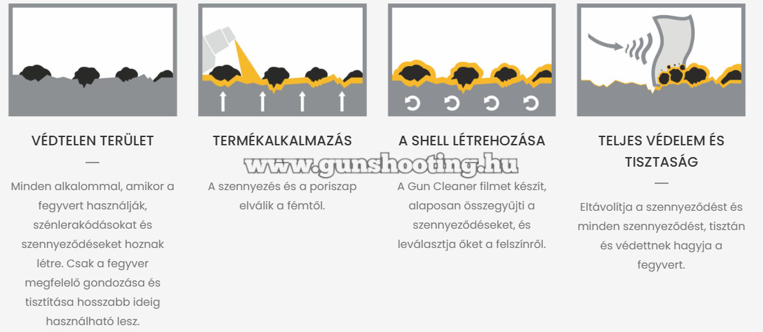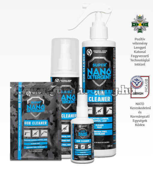 A Super Nano GUN CLEANER gyorsan és könnyedén eltávolítja a szén-dioxidot, régi zsírt, rézet, ólmot, cinket. Nem tartalmaz ammóniát, nincs szaga és mérgező gőze, nem gyúlékony. Beltérben is biztonságos használni, különösen, ha mérgező gőzök jelentenek problémát. Minden iparági szabványnak megfelel a kisfegyver-karbantartásra vonatkozóan. Ártalmatlan fémen, fán, festéken, lakkon, kerámián, gumin, műanyagokon.