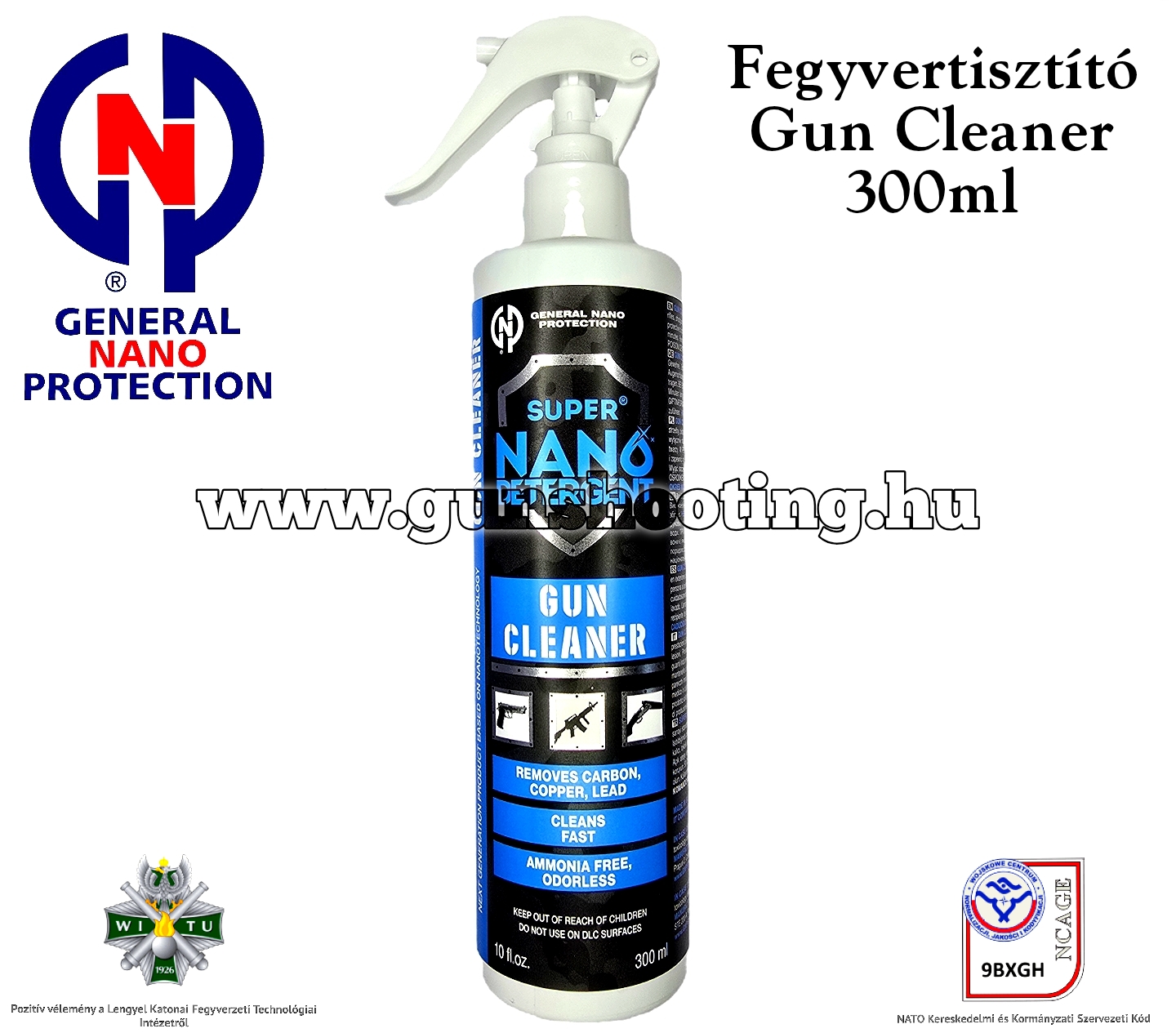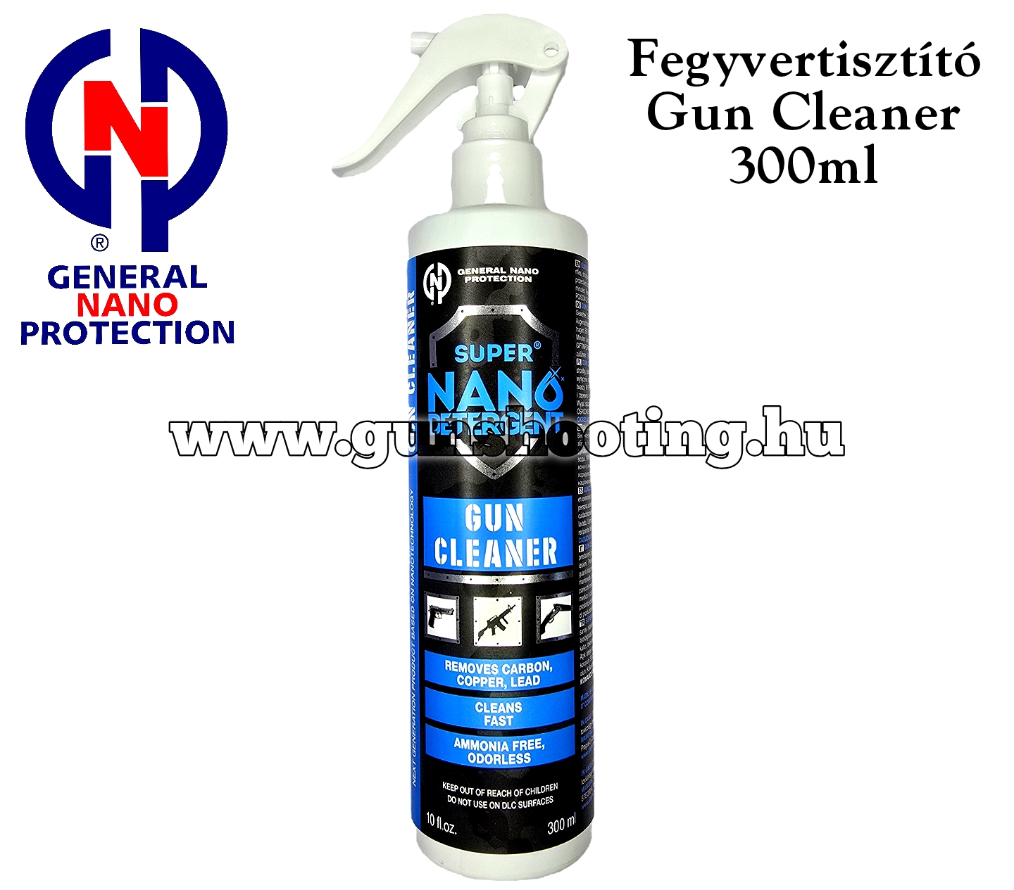 A Super Nano GUN CLEANER gyorsan és könnyedén eltávolítja a szén-dioxidot, régi zsírt, rézet, ólmot, cinket. Nem tartalmaz ammóniát, nincs szaga és mérgező gőze, nem gyúlékony. Beltérben is biztonságos használni, különösen, ha mérgező gőzök jelentenek problémát. Minden iparági szabványnak megfelel a kisfegyver-karbantartásra vonatkozóan. Ártalmatlan fémen, fán, festéken, lakkon, kerámián, gumin, műanyagokon.